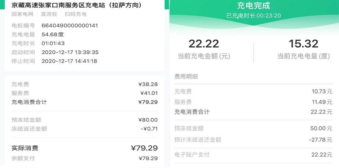 在电量充至78%的时,充电枪意外停止充电,此时充电54.68度,并花费了79.29元(充电费38.28+服务费41.01)。经过重新连接,教授继续为汉EV接入充电,直至车辆表显充至94%时,充电桩自动显示充电完成并结束充电,这会重新充电了15.32度,充电费为22.22元,两次充电总费用为101.51元。