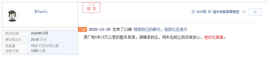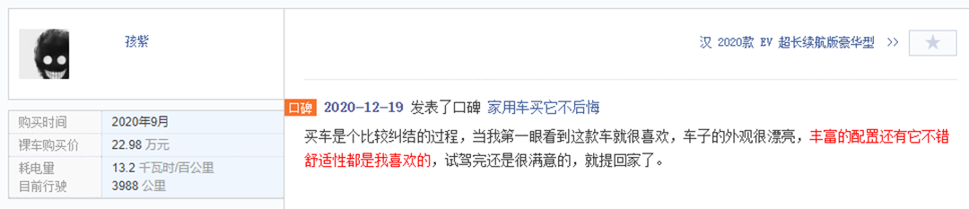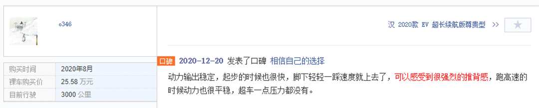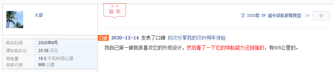 体验完汉EV的冬季旅程,教授也想看看车主们的想法,而在汽车之家上,不少汉EV用户也都留下了自己的用车感受,其中对汉EV的续航、外观、性能、舒适性等方面的评价都颇高。