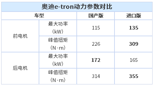 相比进口版,国产版在性能方面略有缩水,前电机功率为115kW,峰值扭矩226N·m,后电机最大功率为172kW,峰值扭矩314N·m。