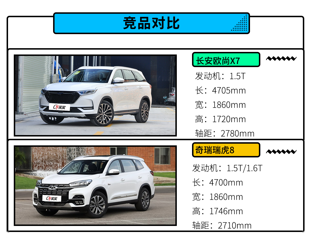 其次是动力方面,瑞虎8分别提供1.5T发动机和1.6T发动机两套动力总成。传动系统分别匹配6挡手动,6挡双离合、7挡双离合变速箱。从动力参数表现来说,长安欧尚X7的动力参数水平介于瑞虎8两套不同动力总成参数之间,根据官方公布瑞虎8百公里6.9-7.4L的油耗表现与长安欧尚X7持平。从整体的表现来说,买买君认为长安欧尚X7更加符合消费者对于紧凑SUV车型空间实用性与经济适用性的追求。