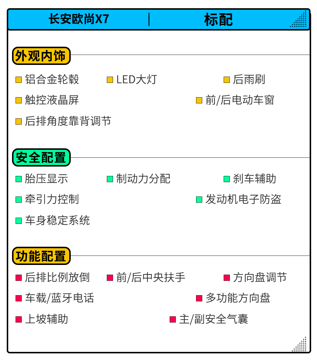 既然是定位家用出行SUV,那么在安全配置方面同样是长安欧尚X7所注重的。全系标配牵引力控制、车身稳定系统、刹车辅助等功能。除了能够为出行保驾护航之外,长安欧尚配备自动驻车、上坡辅助、陡坡缓降、驾驶模式切换等驾驶辅助系统,大幅度提升驾乘操控的便捷性。
