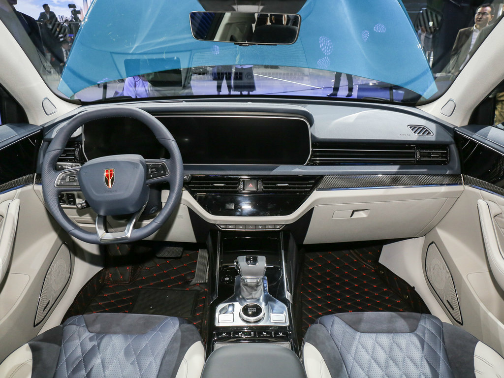 红旗HS5在内饰座舱的氛围营造上主打科技+奢华的风格。中控整体呈现十分平直化的设计,融入许多现代科技化的元素,例如双联屏一体化的设计、贯穿式出风口、内饰氛围灯。座椅采用皮质和Alcantara用料包裹,搭配精致的菱形缝线设计,细节部分采用银色镀铬与高亮黑色饰板以此点缀,突显内饰氛围该有的精致奢华感。