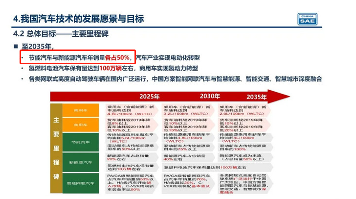 按照线路图2.0,乘用车(含新能源,双积分)油耗到2025年要降至4.6L/100km,2030年降至3.2L/100km,而到了2035年则降至2.0L/100km。