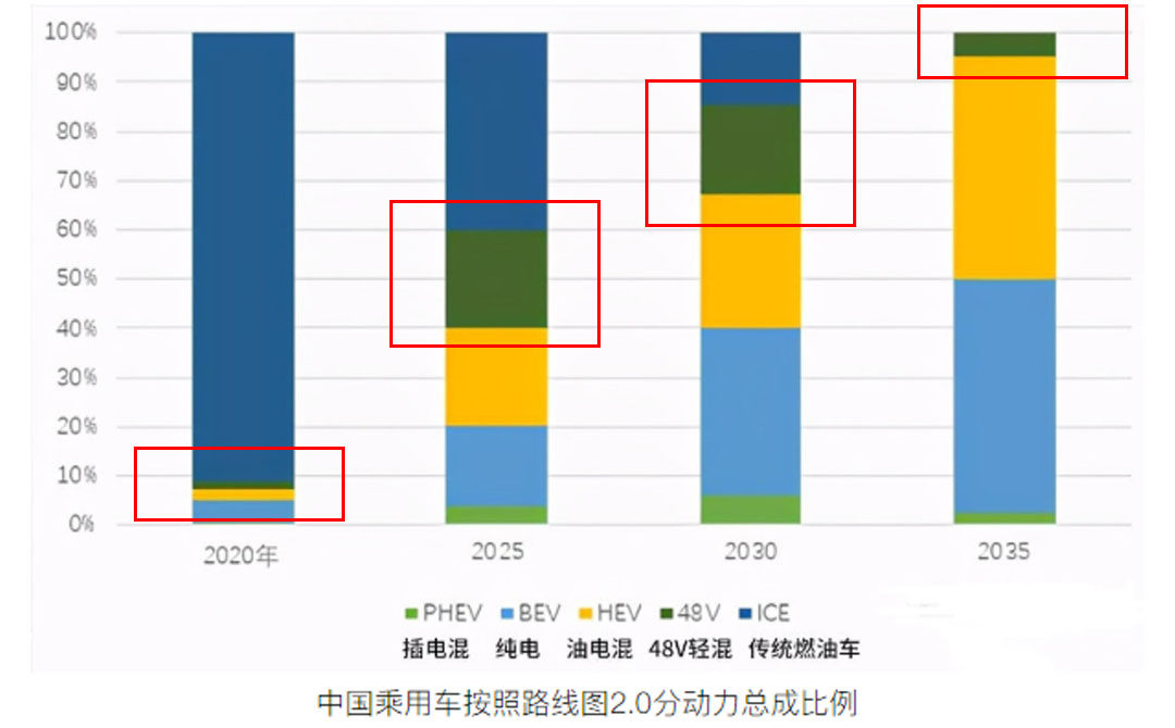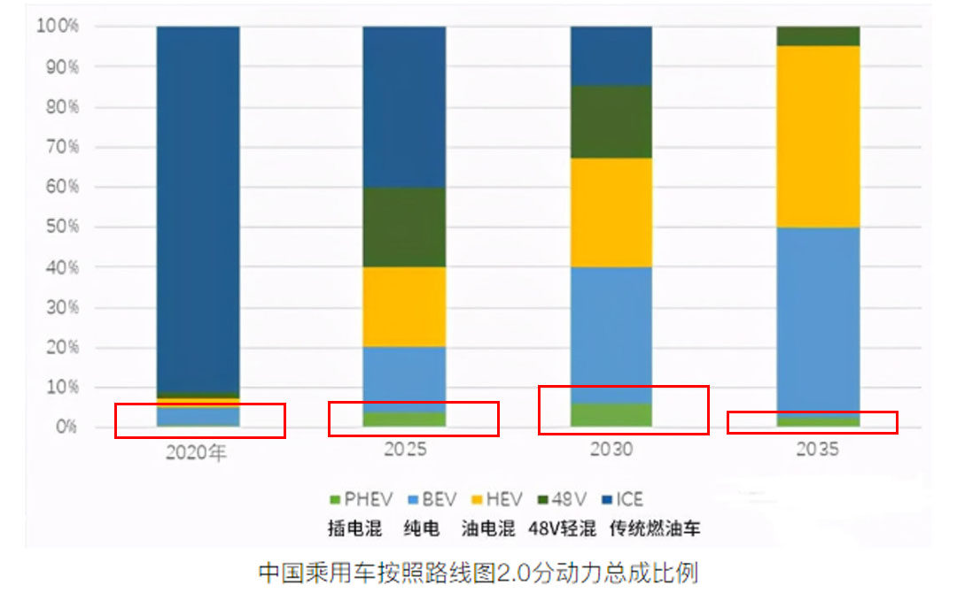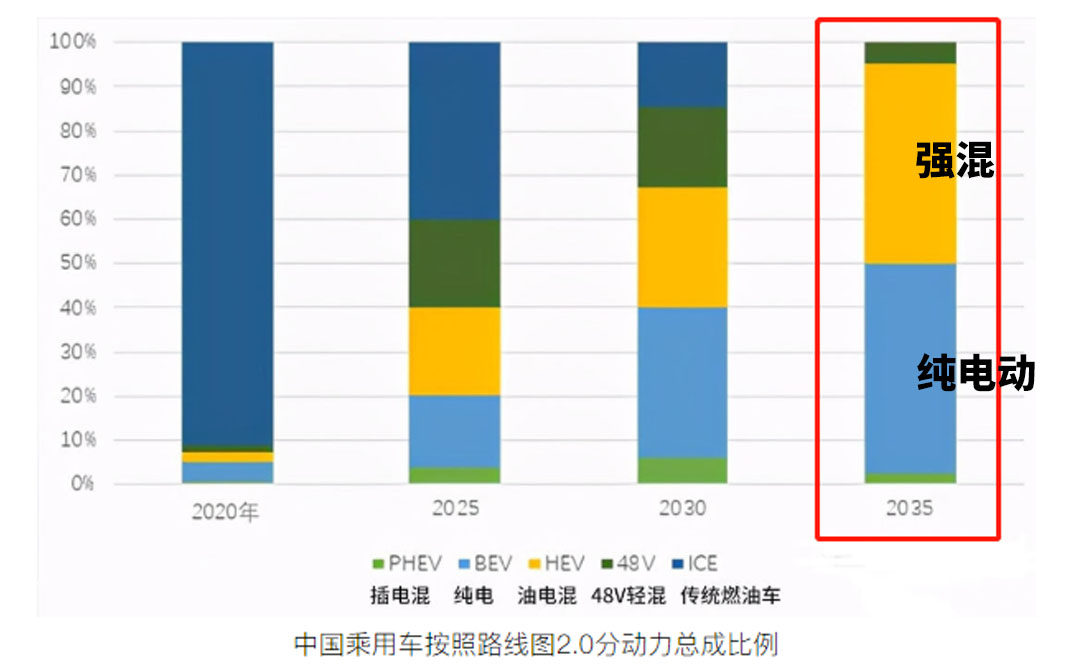 另外按照《线路图2.0》的动力总成比例来看,未来节能车主要以HEV(强混)为主,新能源车主要以纯电动车为主,到了2035年,两者的占比超过95%。而PHEV(插电混)和48V轻混主要起过渡作用。