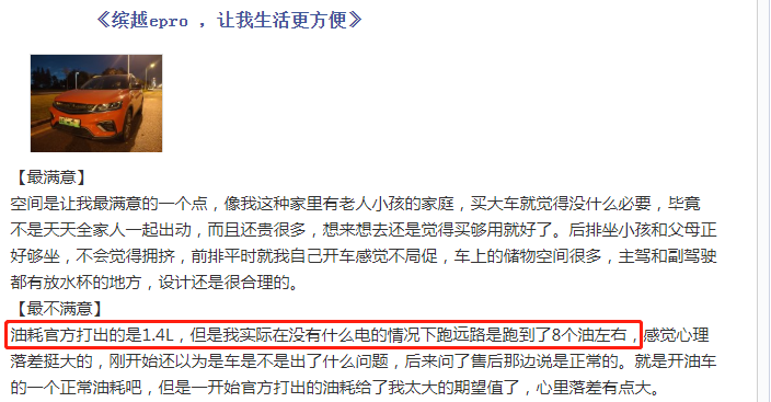 搭载了该系统的缤越ePro车型,官方打出了1.4L/100km的油耗,而车主实际跑到了8L左右。出于对吉利品牌的信任,车主起初以为车子出了问题了,并咨询了售后,没想到却被告知“正常”,让车主感受到蛮大的落差。