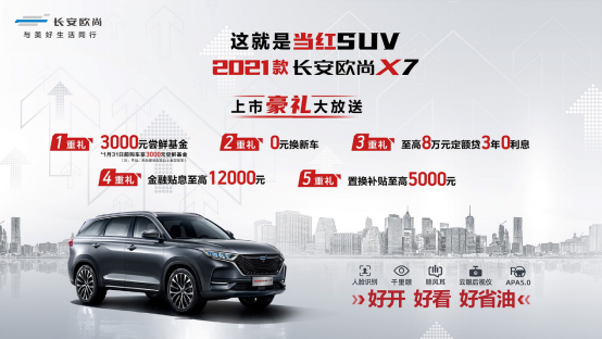 为致敬广大用户的厚爱, 2021款欧尚X7在价格、政策上也带来更多福利,可享受包括3000元上市尝鲜基金等共计5重豪礼,为更多的中国大家庭用x户带去美好车生活。