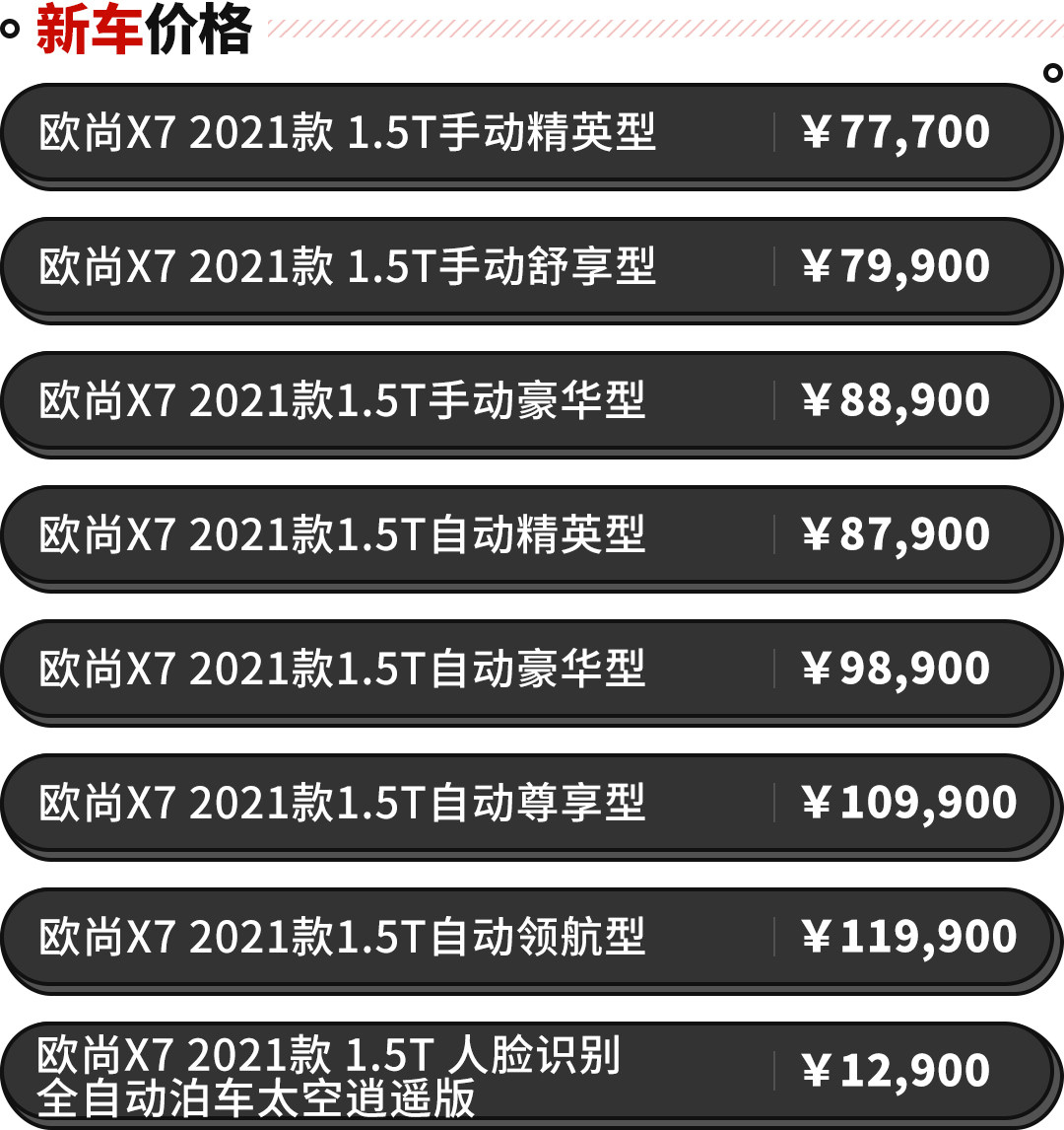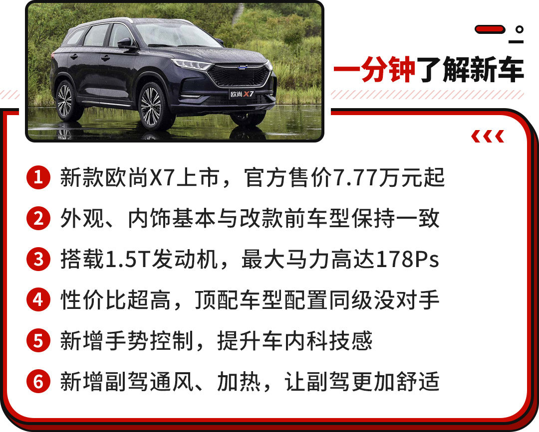 而欧尚甚至连今年最后的几天也没闲着,就在12月29日当天,推出了欧尚X7中期改款车型。改款前的欧尚X7在去年十一月正式上市,仅今年前十一个月便售出超过八万辆,可见该车的势头较好。而推出的中期改款车型,其官方售价为7.77万元-12.99万元,新车究竟有什么亮点呢?