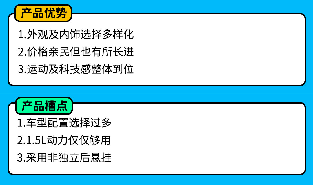 相对而言,该车的劣势并不算特别致命,只是车型配置过多容易让用户不知如何选择,同时1.5L的动力放在同级当中确实有点偏弱,只能达到仅仅够用的水平。采用非独立的后悬挂虽然同级不少车型有是如此,但如果该车能配备独立悬挂,那差距将能进一步拉大。