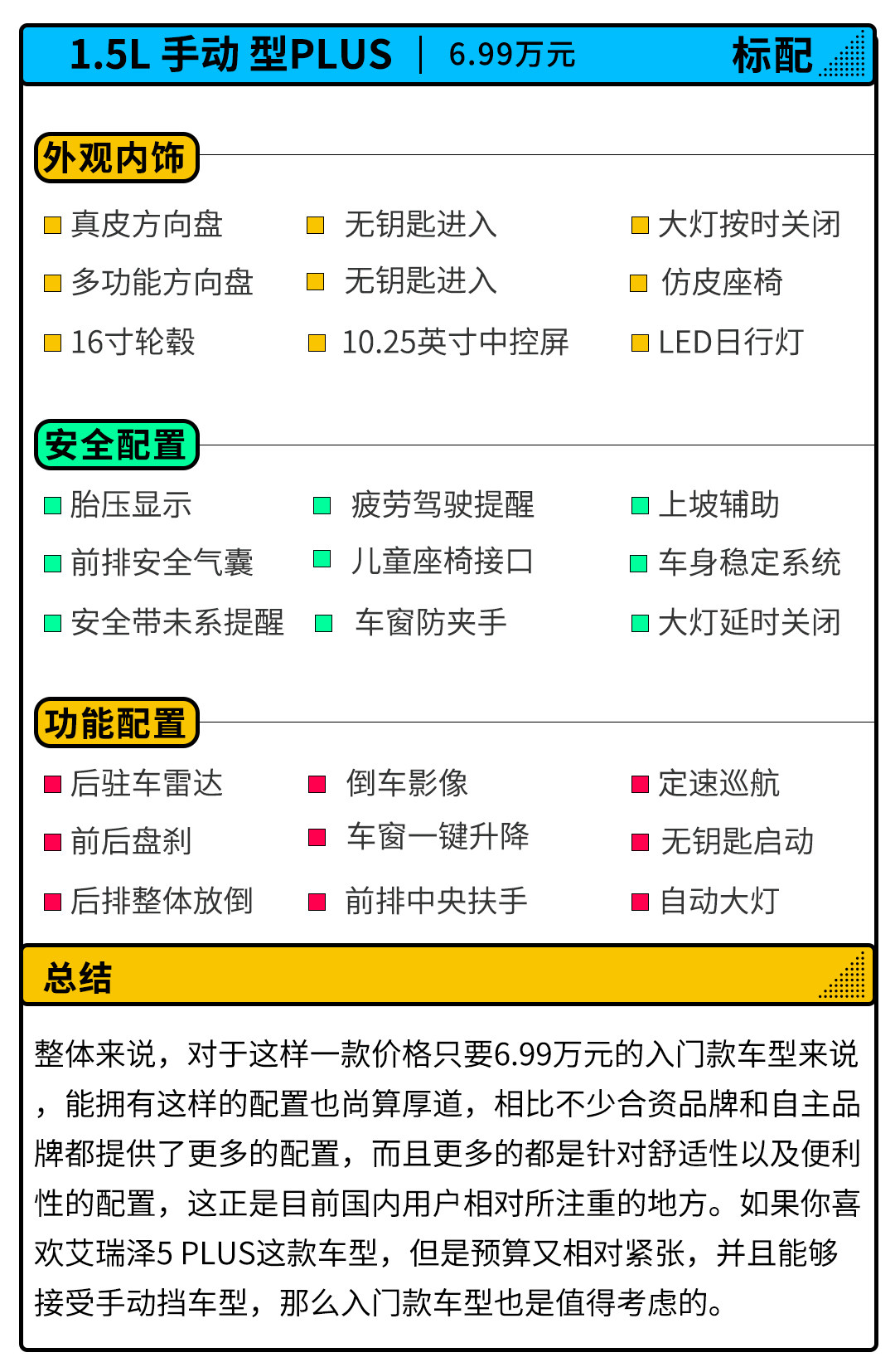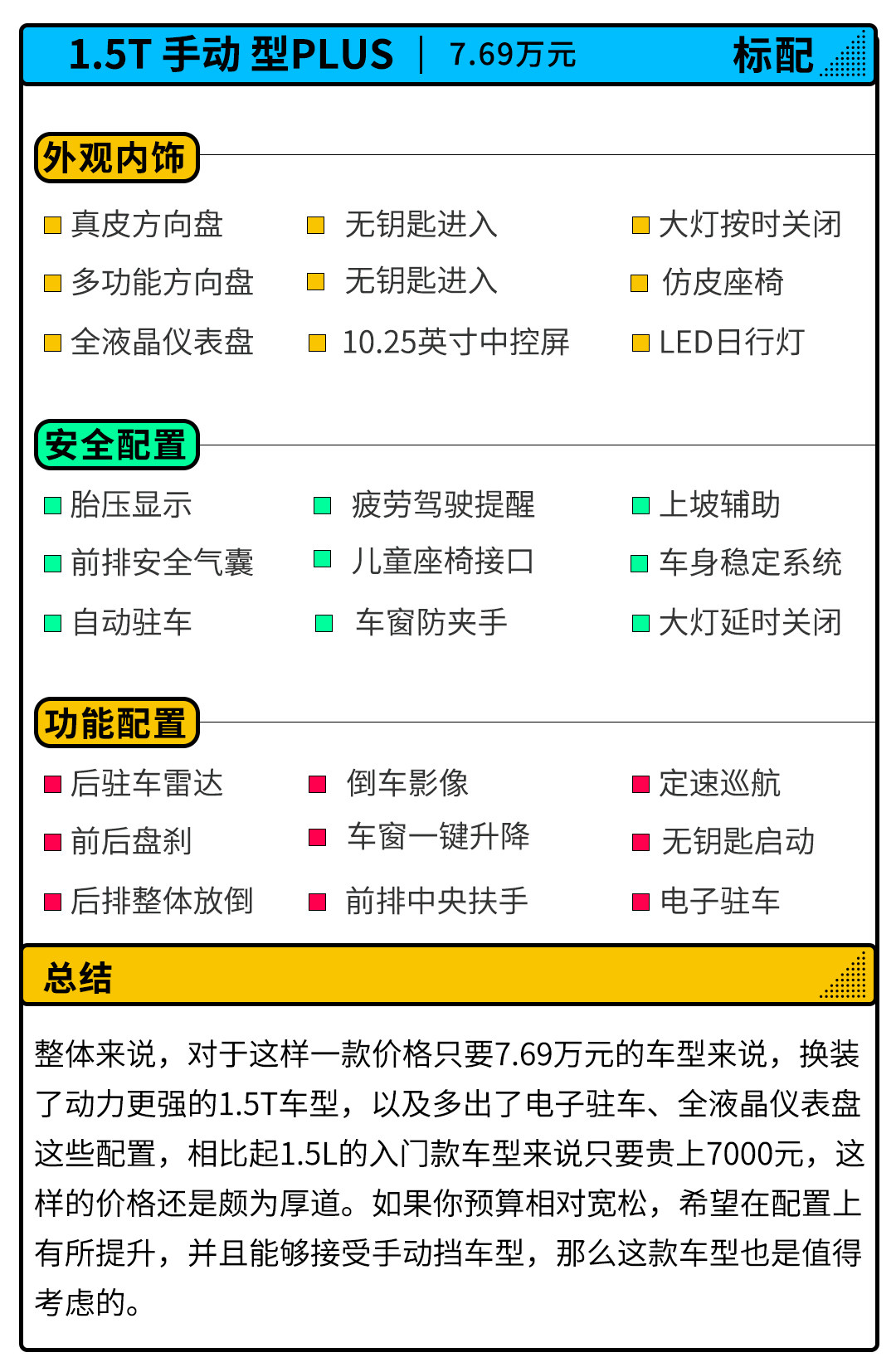 再看1.5T的手动型PLUS,相比1.5L车型贵了7000元,但获得的是156匹的1.5T发动机,同时配置上多了电子手刹、全液晶仪表盘、座椅高低调节,买买君认为这还是非常值得的。