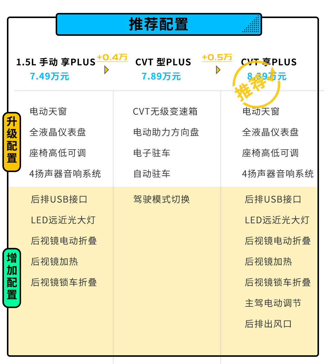 多花8000元,获得的是自动挡的型PLUS车型,在配置不变的情况下换成了CVT变速箱以及电动助力方向盘,同时多了驾驶模式切换,如果不喜欢手动挡车型的用户还是可以选择这一款的。