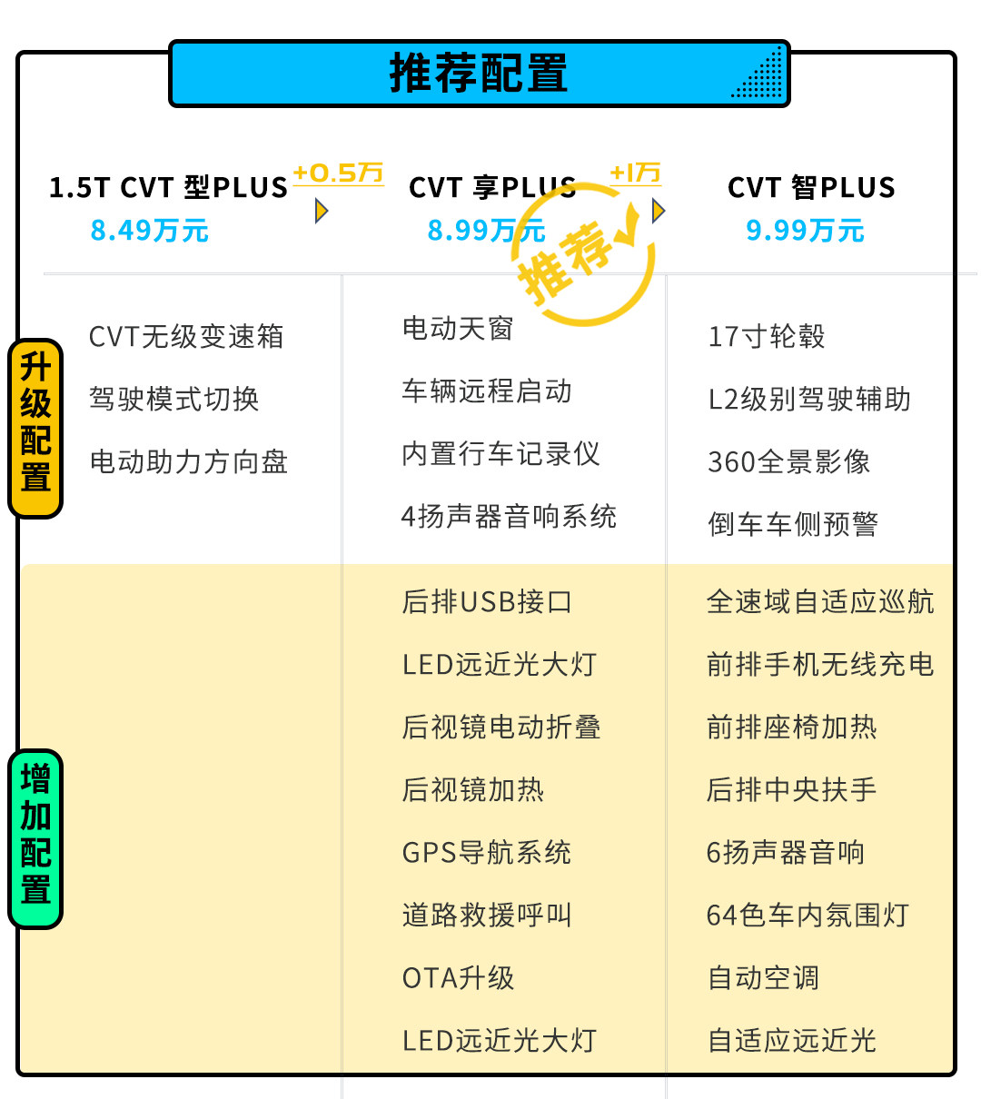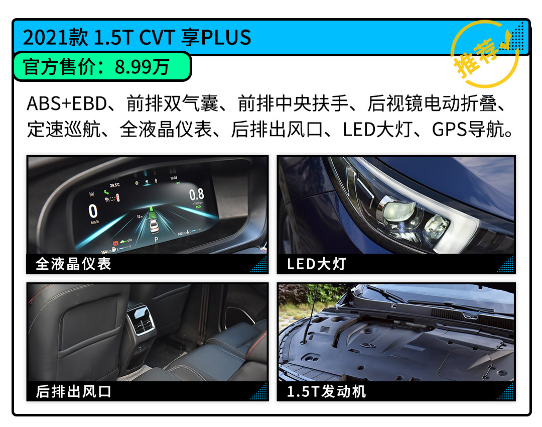 如果要说全系最推荐的车型,买买君还是选择1.5T的享PLUS车型,除了在动力上得到升级之外,在科技性、便利性的配置上都有着不错的表现,因此作为全系的首推车型。