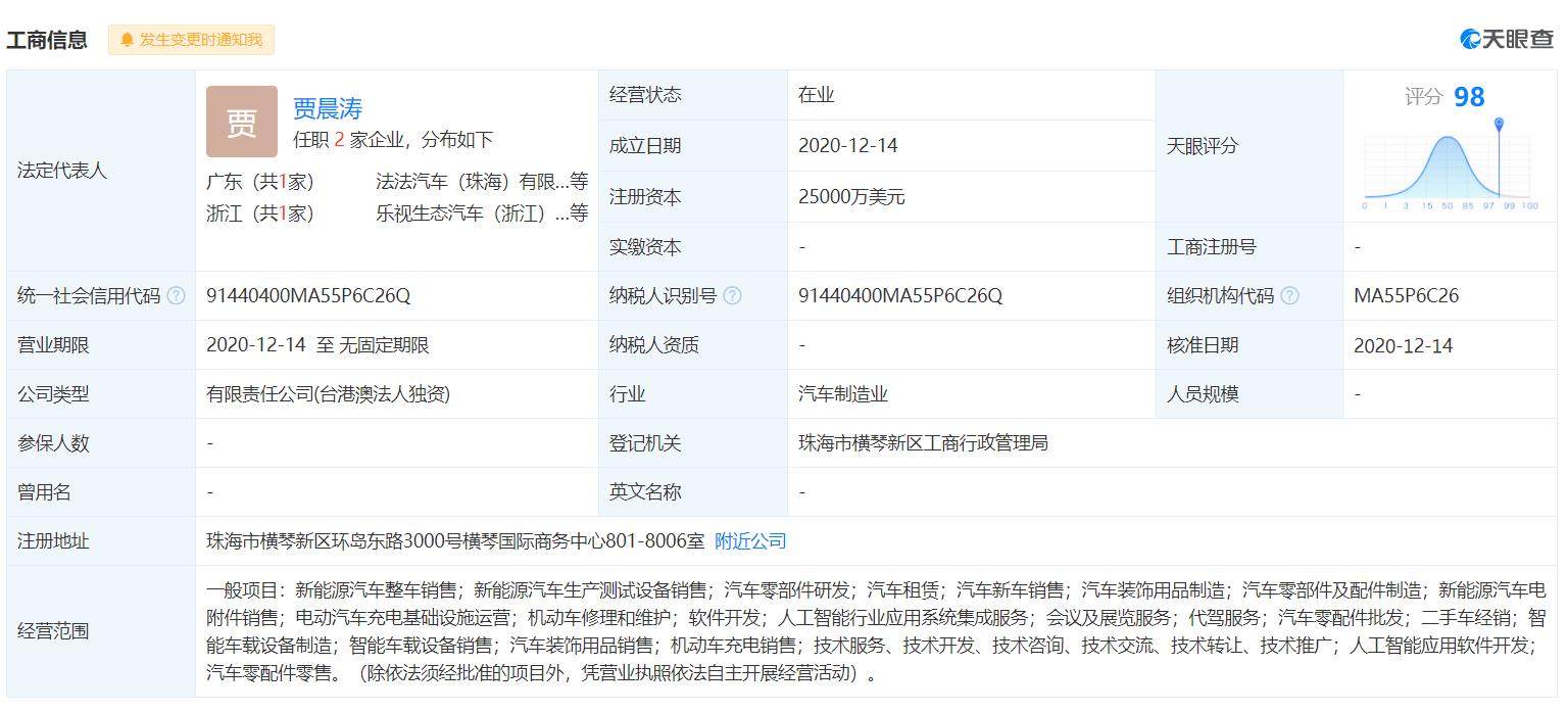 近日,法拉第未来(Faraday Future)近日在广东珠海成立法法汽车(珠海)有限公司。根据天眼查所显示的内容,于2020年12月14日注册成立,注册资金25000万美元,由FF香港公司100%控股。