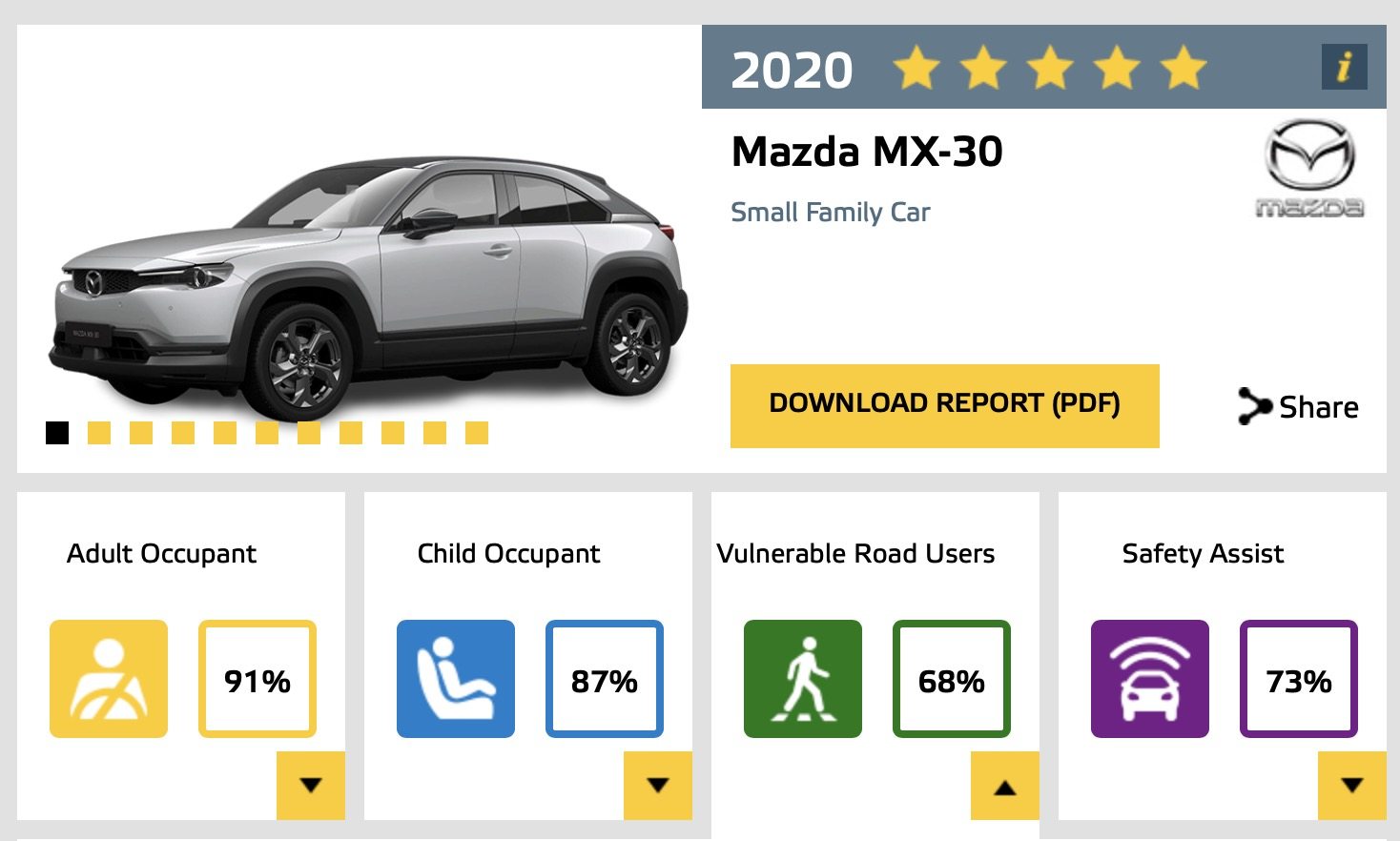 也是因此,马自达CX-30同样获得了五星的评分,在成员保护方面更是可以达到91%的水平,一度超过了上述所说的几款车型,从此可见马自达乃至日系车型在安全保护方面还是不错的。