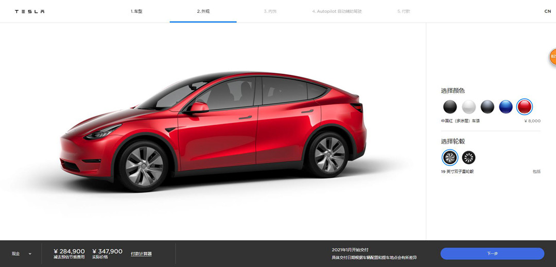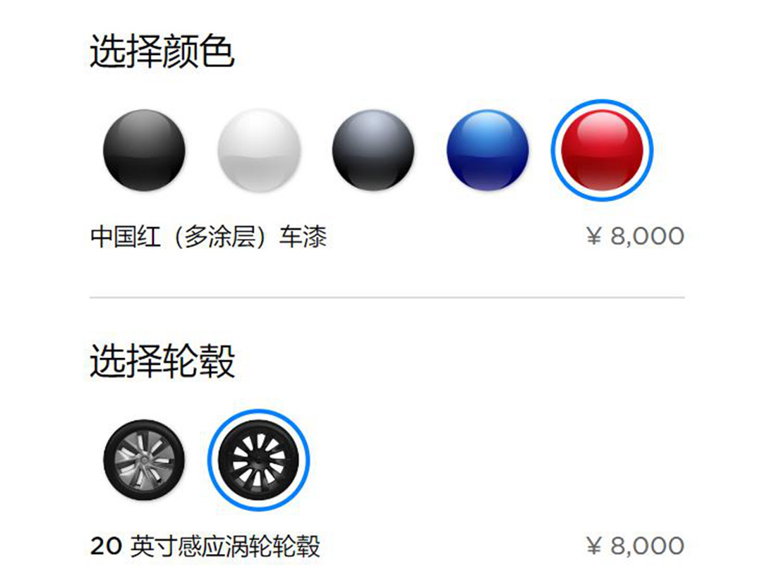 车身配色方面一直是特斯拉备受吐槽的焦点,皆因在Model 3上除了黑色以外其他配色均为选装形式提供,也就是得加钱,在Model Y这次同样也不例外。新车共提供纯黑、珍珠白、冷光银、深海蓝以及中国红五种外观配色,除了纯黑以外其他配色均需加价8000元人民币。相比之前进口版中国红选装需要加23100元,你也能理解成国产后比之前“厚道”了,但其实还是挺坑的,不喜欢黑色的话只能老老实实加价购买了。