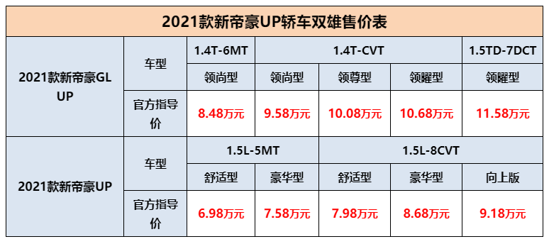 2021款新帝豪UP:6.98万-9.18万元,造型、智能升级,稳坐7万级家轿性价比之王