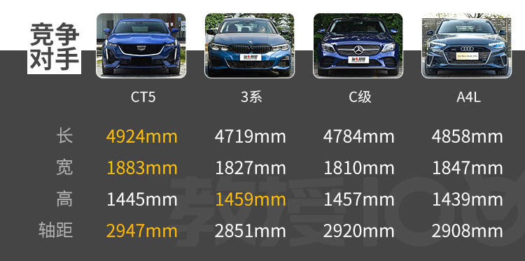 在尺寸上,虽然CT5比3系、C级长轴和A4L更长,尺寸上更胜一筹。