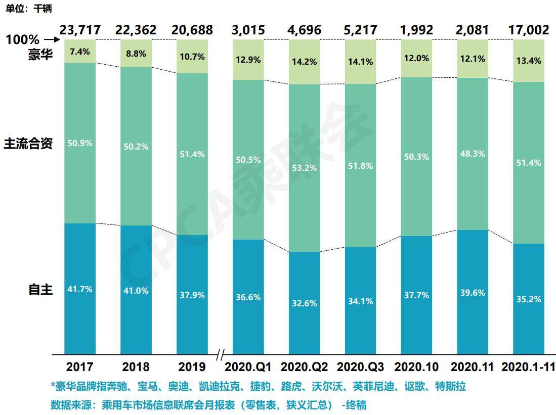 乘联会数据显示,豪华品牌的市场份额逐年增长,2020年前11个月,售价30万元以上的车型占据市场份额近1成,豪华品牌销量占据总市场份额的13.4%,比起2017年几乎翻了一倍,也就是说100人里面,有13个以上都是在开豪车。