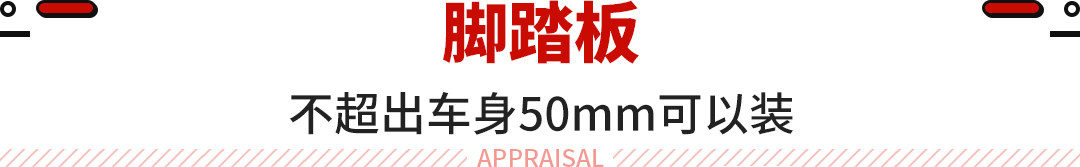 如果选择为爱车安装这一类固定式脚踏板,就需要严格按照规定选择脚踏板产品,安装后的单侧踏板不得超出原车身宽度50mm。
