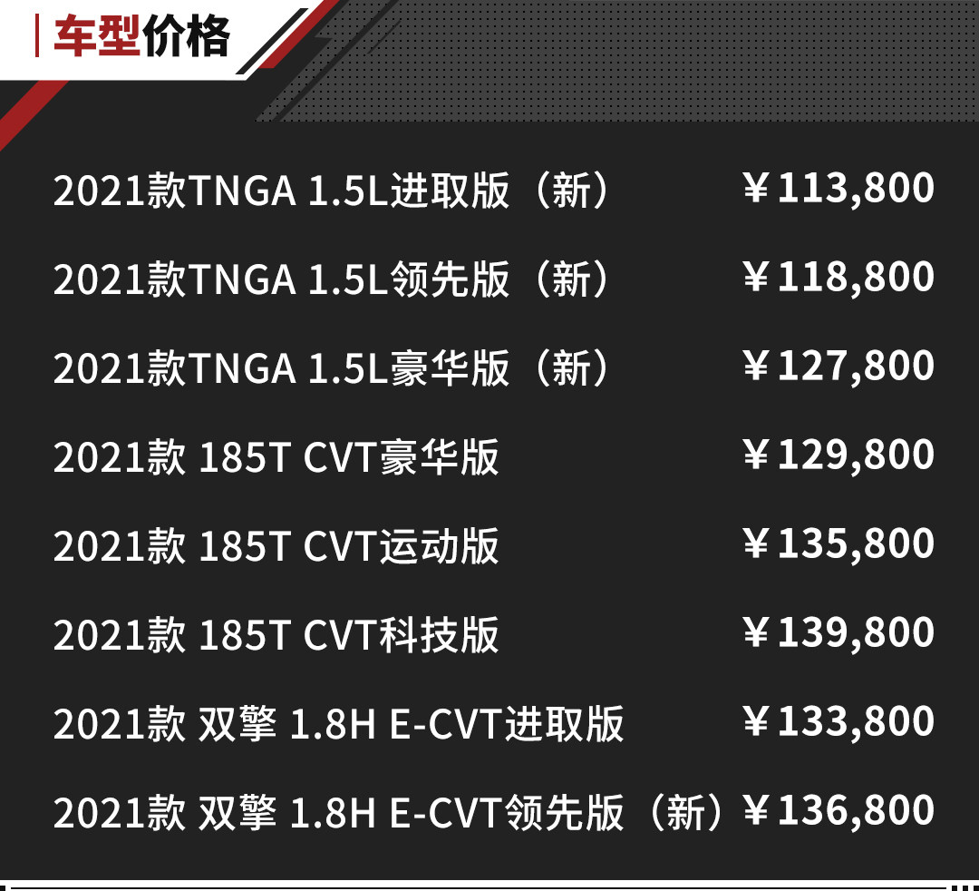 从官方公布的信息来看,新款雷凌取消了1.2T原有的进取版和尊享版车型。但在新增1.5L三缸车型的同时,还加入了1.8L双擎领先版,进一步扩大1.8L双擎的销量占比。整体来看,2021款雷凌燃油版和混动版车型各占了一半。