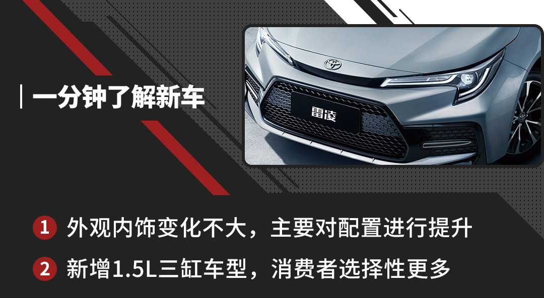 基于TNGA架构的雷凌自2019年上市以来,销量就不断攀升。即使是面对国内汽车市场整体下滑的2020年,雷凌家族依然用了不到11个月的时间,突破了20万的销量。而今雷凌推出1.5L三缸版本车型,确实降低了其购车门槛,这也是相比老款车型最明显的改变。