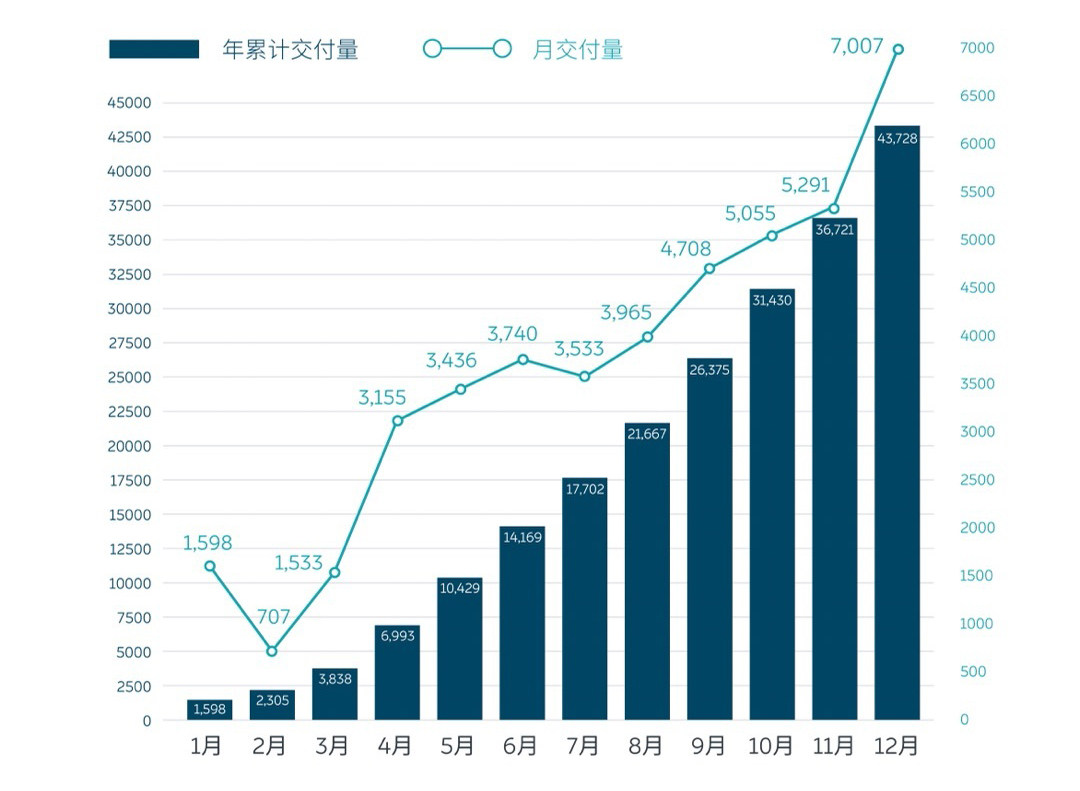 回顾整年,蔚来在今年1月份还曾同比下滑11.5%,并且此后受疫情影响,2月份销量也仅为707辆。但在疫情之后,蔚来汽车的销量迅速增长,4月份后销量就持续突破了突破了3000辆,直到12月首次创造交付7000+辆的好成绩。