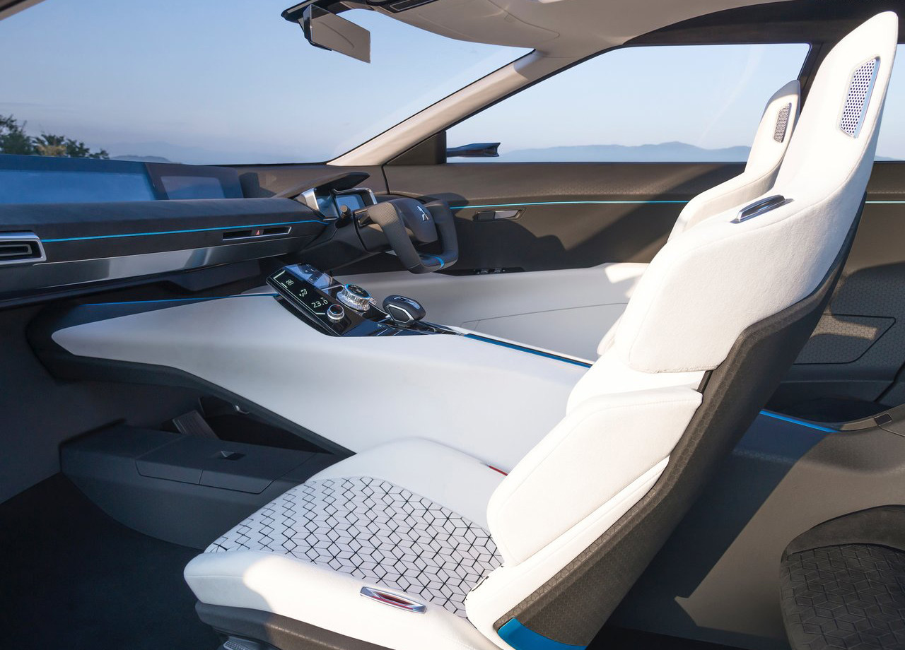 e-EVOLUTION的内饰采用了环抱式的设计风格,并且其深灰色与白色的撞色搭配,再加上蓝色元素的点缀,仿佛让人置身于未来。座椅前方采用了一体式屏幕,除了视觉效果突出外,也能更好的承载智能系统。
