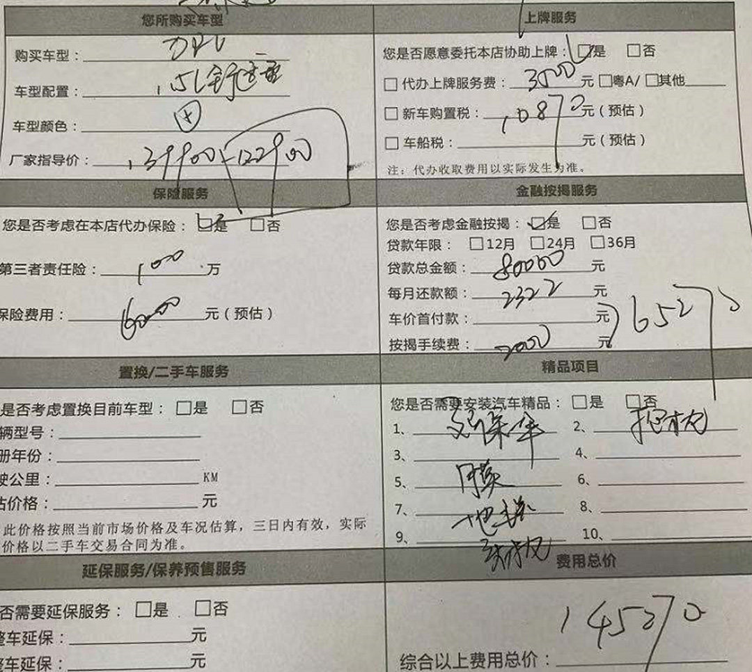 其中保险费6000元是偏高的,上牌费用3500元(有点不厚道),金融费2000元(收可以收,但贵了点)。