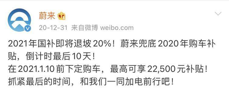 蔚来官方表示:凡是2021年1月10日及之前支付大定的用户,依旧可享受2020年国家新能源补贴,其中差额由蔚来汽车承担,蔚来为大定的用户准备了14400-22500元的购车补贴,此一承诺,蔚来旗下的EC6、ES6和ES8三款产品均适用。