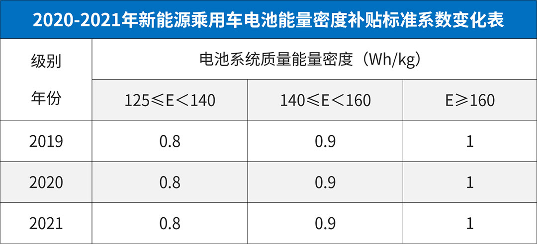 不变的地方体现在对享受补贴车辆的技术要求层面,动力电池能量密度标准和2020年继续保持一致,125-140Wh/kg按照0.8倍补贴;140-160Wh/kg按照0.9倍补贴;160Wh/kg以上按照1倍补贴。除此以外,新一轮补贴政策,对车辆的能耗标准要求也维持原样。