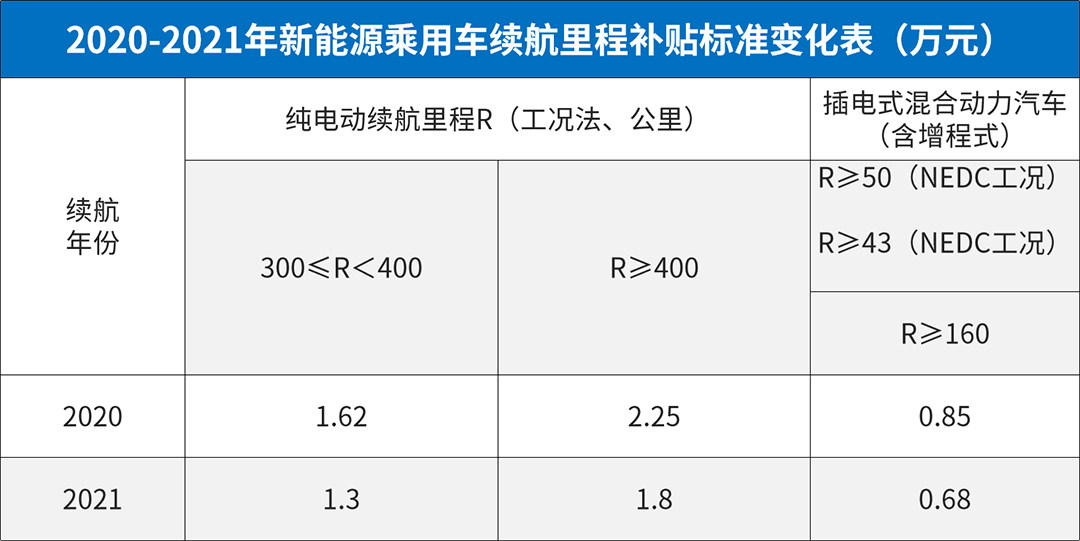 根据2021年新能源补贴新政,纯电动车300<续航<400km的车型,可享受补贴额度由原来的1.62万元调整为1.3万元;续航里程>400km的车型,补贴额度由原来的2.25万元调整为1.8万元,插电混动车型补贴由原来的0.85万元调整为0.68万元。