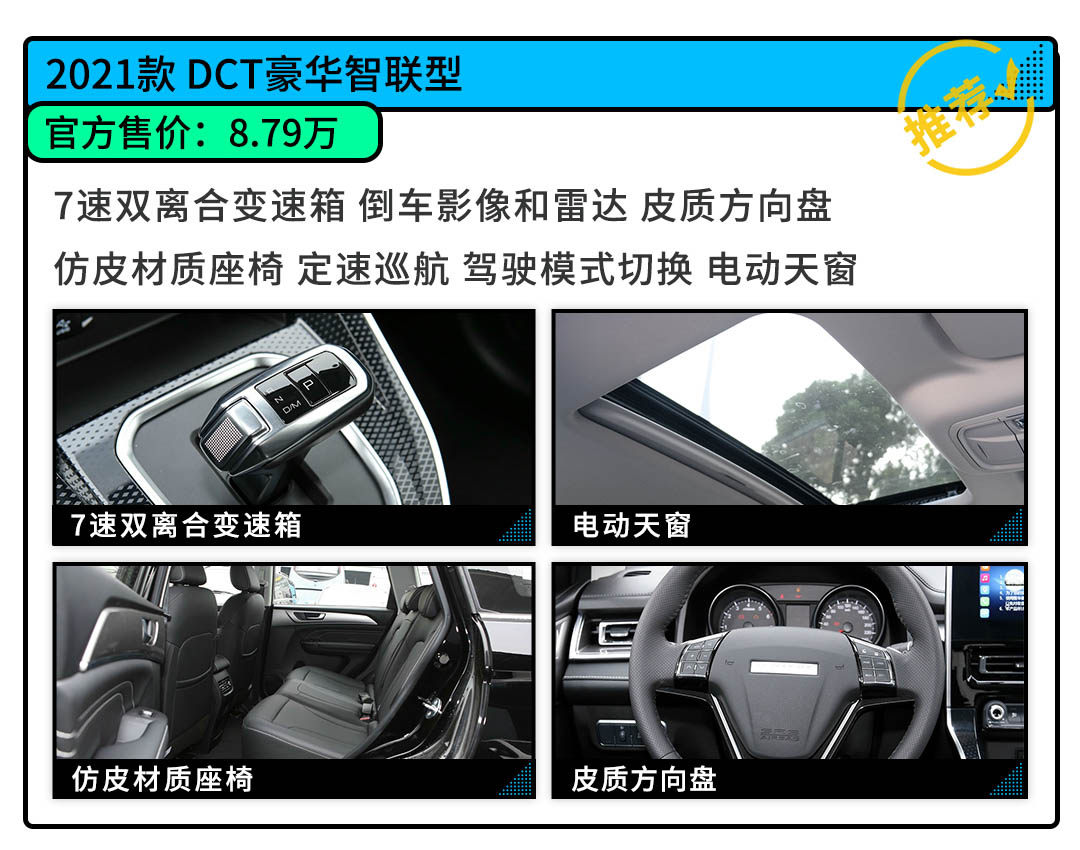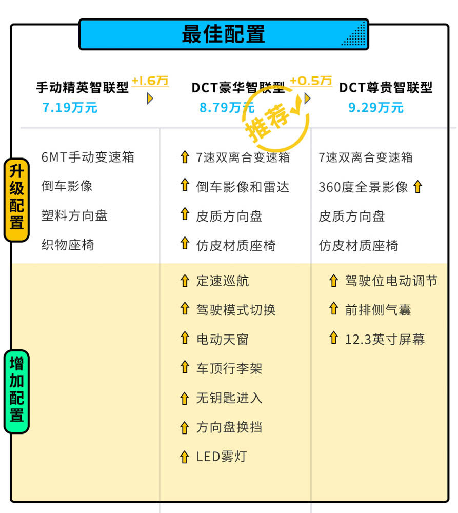 最低配的配备前面已经做过分析,可以发现配置已经足够完善了,但距离丰富还是有一定的距离,所以小编更推荐购买的是指导价为8.79万元的DCT豪华智联型,虽然与最低配车型差价达到了1.6万元,但是配置方面明显更加丰富。