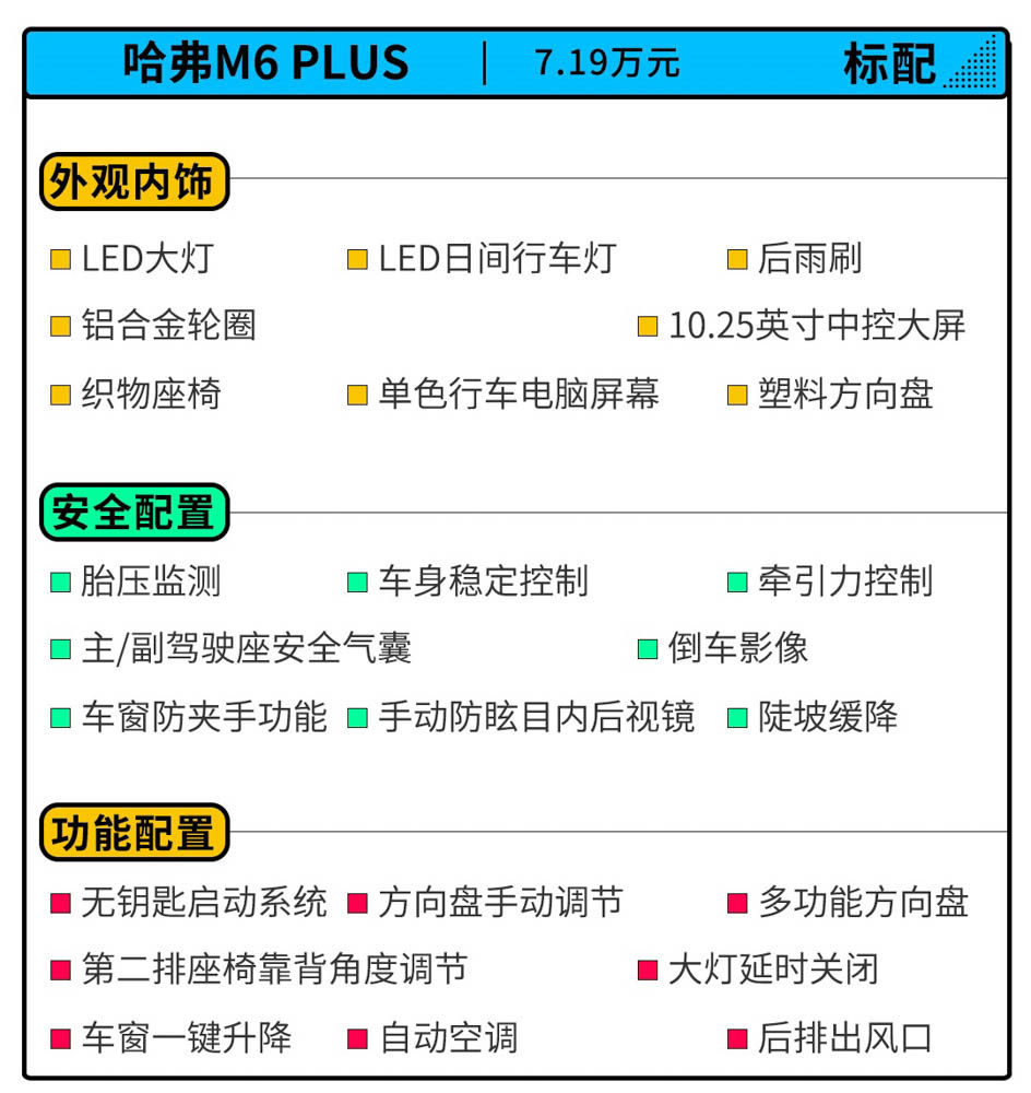 M6 PLUS不光在外观和内饰上有变动,在配置上也有着很大的进步,毕竟这个价位段的消费者在购车时对于配置是十分在乎的。而M6 PLUS主打的就是物美价廉的风格,所以可以看到即便是最低配的车型版本也有着很丰富的配置,例如LED大灯、铝合金轮圈、10.25英寸中控大屏等很显档次感的配置,反正属于那种让人一眼过去看不出高低配的类型。