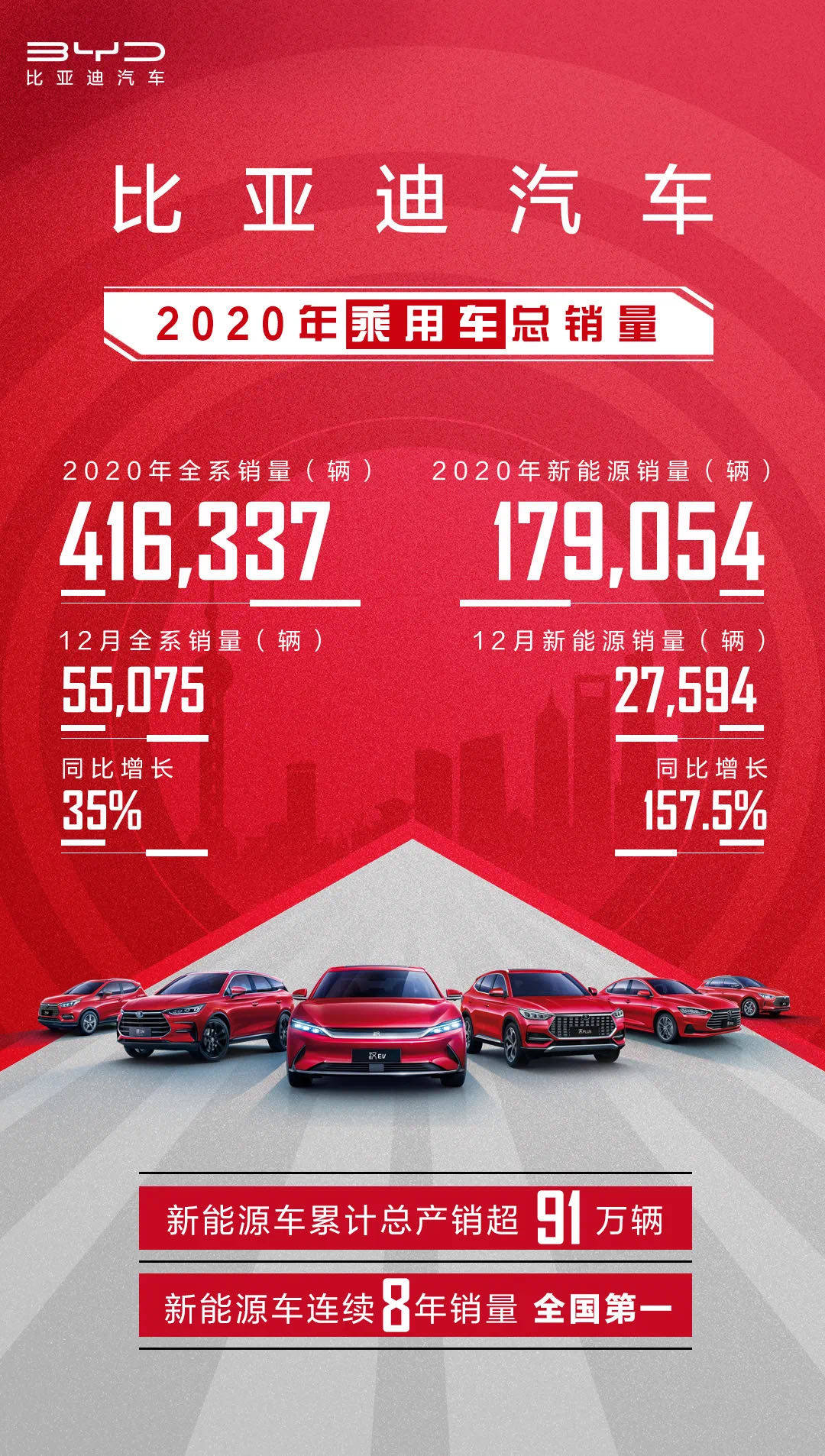 据近日公布的销量情况来看,2020年比亚迪乘用车全系销量416337辆,12月全系销量55075辆,同比增长35%。其中新能源车全年销售179054辆,12月销售27594辆,同比增长157.5%,新能源车累计总产销超91万辆,连续8年稳居全国第一。当然,比亚迪燃油车在2020年也逆市上扬,全年销售237283辆,同比增长2.3%。