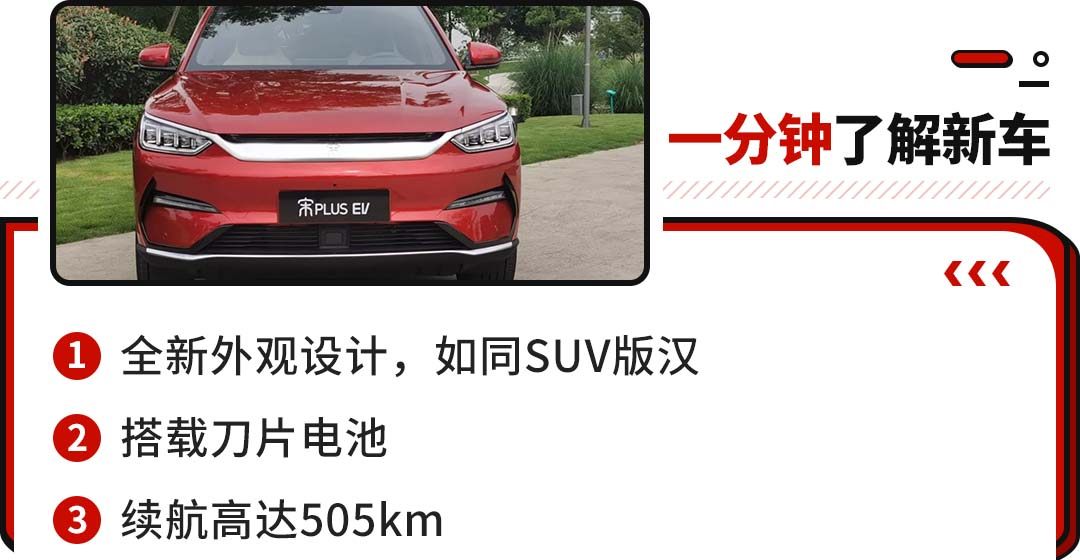 宋PLUS定位于宋Pro和唐之间,相比宋Pro,其有着更长、更宽以及更低的车身,可以算得上是大号的紧凑型SUV了。相比起早前发布的燃油版,EV版的宋PLUS外观多出借鉴了汉,前脸封闭式设计,采用Dragon Face3.0设计理念,造型会更加前卫。更重要的是,宋PLUS EV搭载的是刀片磷酸铁锂电池,NEDC续航里程达到了505公里。
