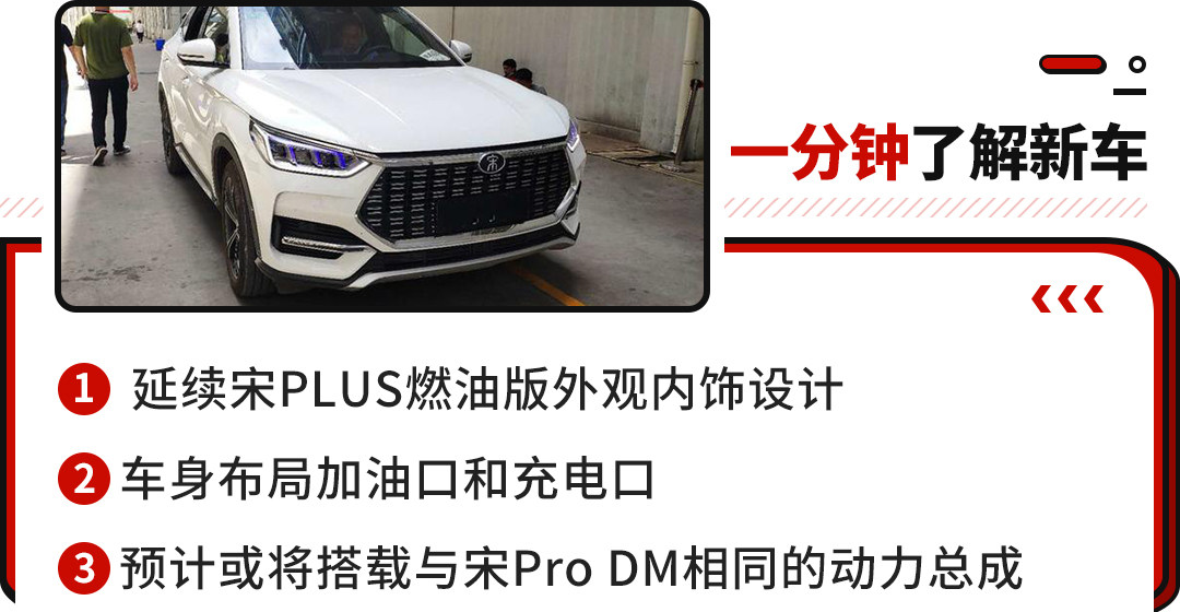 宋PLUS DM延续燃油版造型设计,镀铬饰条贯穿两侧头灯,大嘴的设计让整体看起来更具时尚动感。内饰设计以及车身尺寸预计也和燃油版一致,长宽高分别为4705 / 1890 / 1680mm ,轴距为 2765mm,并在两侧布局了充电口和加油口。目前新车动力暂未有详细信息,预计或将搭载与宋Pro DM相同的动力总成。据悉,比亚迪会率先推出宋PLUS EV纯电版,而混动DM版会推迟出现。