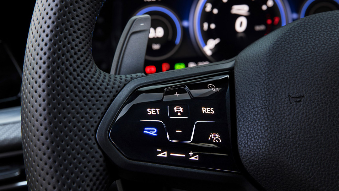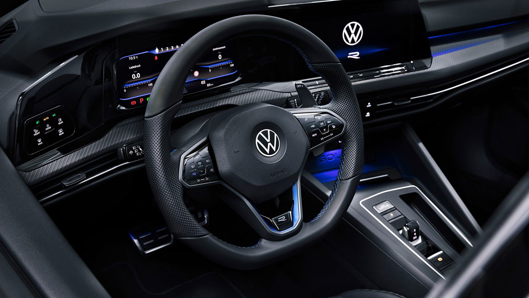 内饰方面,全新高尔夫R同样使用跟普通高尔夫类似的内饰,双联屏的设计是“数字高尔夫”的标志,同时车内使用大量蓝色装饰条去凸显高尔夫R的身份,方向盘后面大尺寸的换挡拨片似乎表示其不俗的性能。方向盘上蓝色R按钮可以一键切换战斗模式,随时应对路面上一切挑衅。
