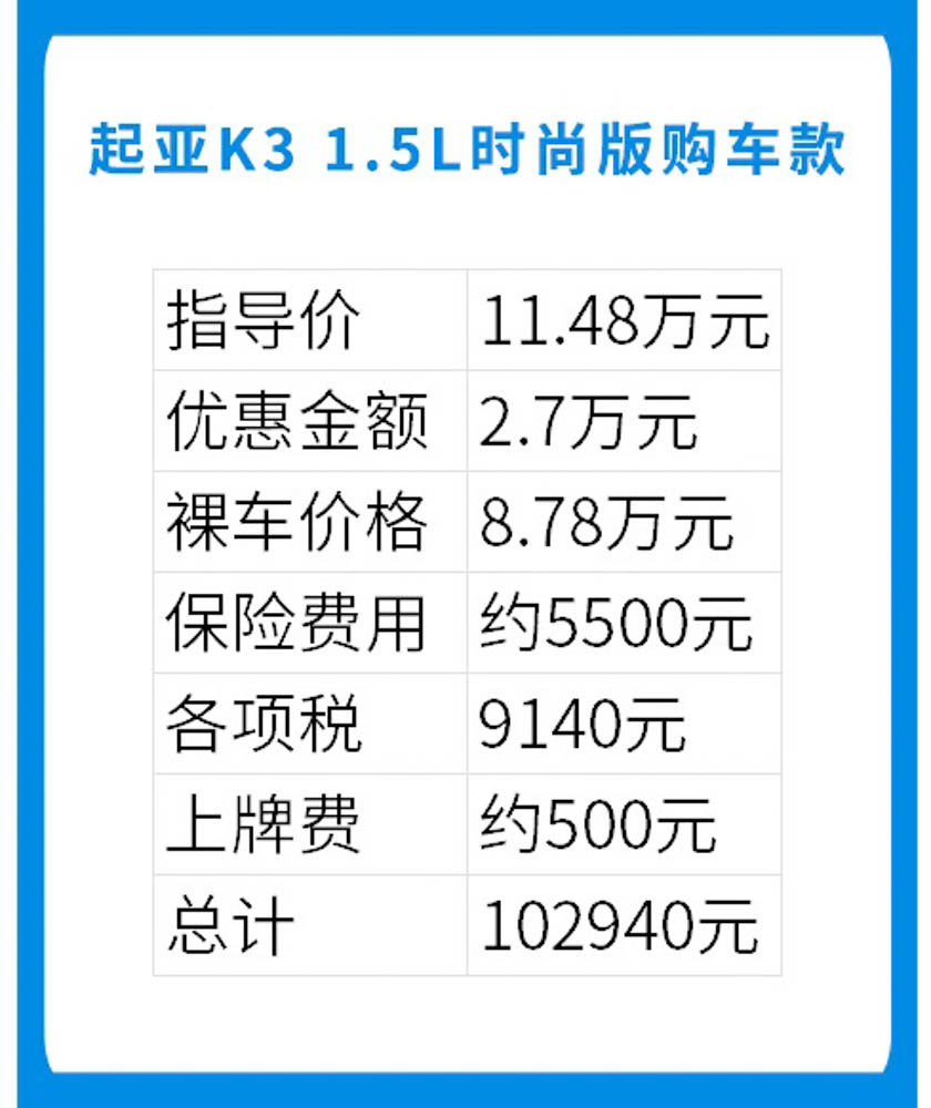 正如前面所说,K3除了它的配置极高之外,价格也是十分有优势,根据目前经销商给出的2.7万元的优惠金额,小编算了一下,全款落地1.5L时尚版车型大约需要102940元,比起同配置的大众车型至少便宜了两万元左右,可以说是性价比很高了。