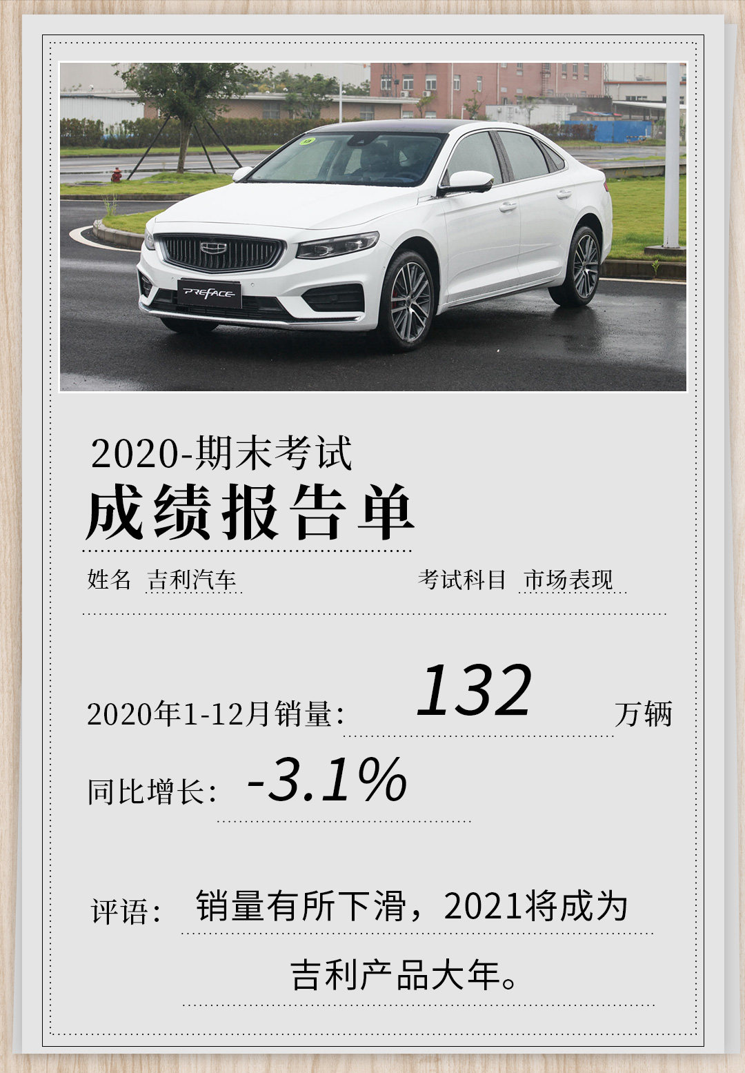 作为近几年来自主品牌中势头最迅猛的力量之一,吉利汽车在2020年累计销量1320217辆,虽然比起去年136.15万辆的销量有所下滑,但总算也是在这多事之年中完成了既定的销量目标。