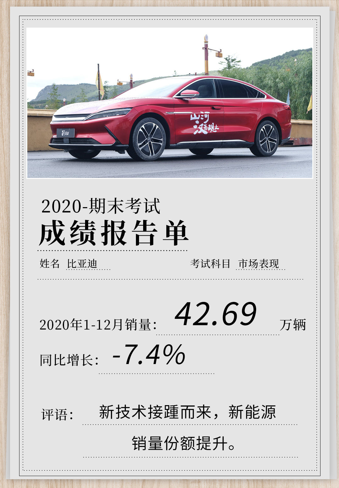 近日,比亚迪公布了其2020年销量,过去一年里比亚迪汽车累计销量42.69万辆,同比下降7.46%。分驱动形式来看,比亚迪新能源汽车全年销量为18.96万辆,燃油汽车全年销量23.72万辆。