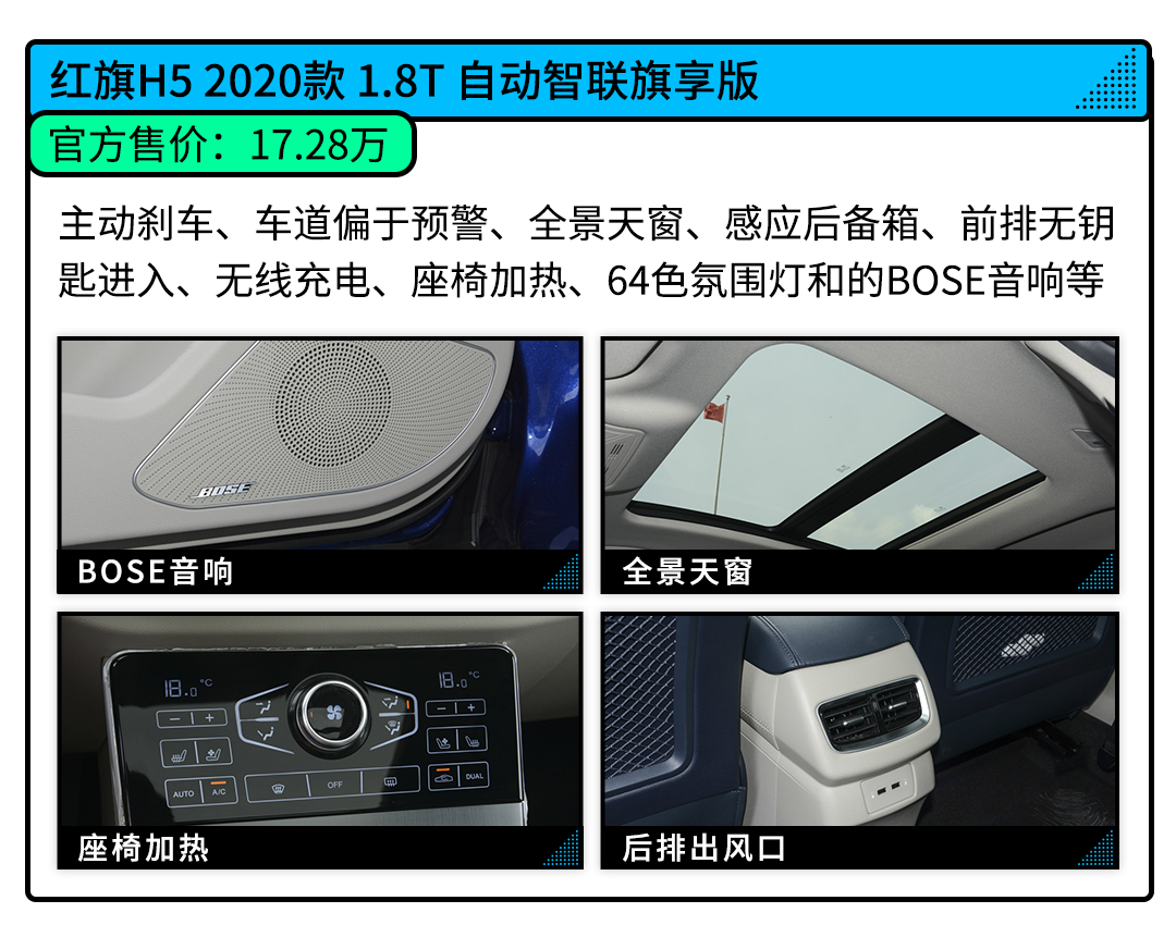 价格和服务体现了优势,配置也要跟到位,国人最喜欢“货比三家”,选车时不单单只看一款车,都是多款车型横向对比,在实力较为接近时,丰富的配置也许就能到消费者是一颗“定心丸”。红旗H5全系标配10英寸中控屏、7英寸液晶显示屏、游艇式的电子挡把等配置,在同级别里也算是良好成绩了,而在中配车型以上,标配有主动刹车、车道偏于预警等安全配置,以及全景天窗、感应后备箱、前排无钥匙进入、无线充电、座椅加热、64色氛围灯和11个扬声器的BOSE音响等等加分配置。