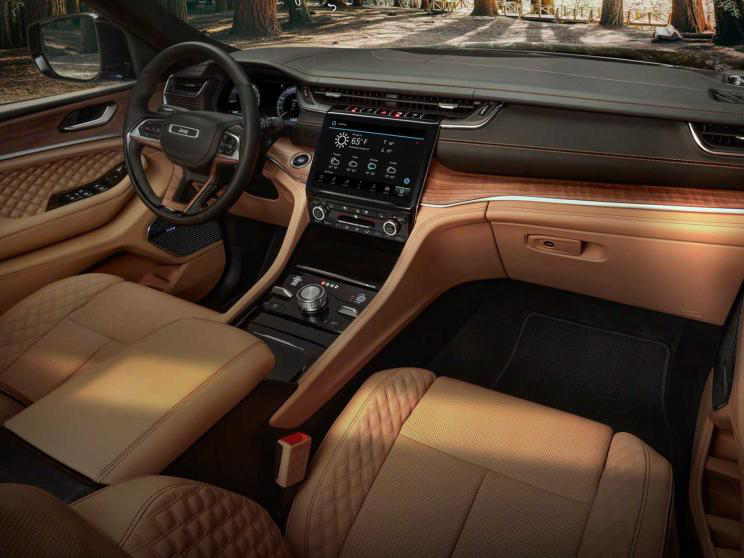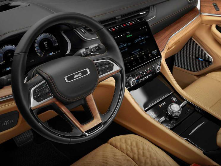 大切诺基L内饰大改以往中庸、成熟的风格,不论是用料还是内饰布局设计上要更加偏向于豪华科技驾乘的定位需求。首先座椅与门板采用高档皮质包裹覆盖,搭配精致的菱形缝线处理,中控采用精致的木纹装饰搭配。其次,大切诺基L虽然保留了一定的试题按键操作布局,但是搭配液晶仪表以及触控大屏的设计让整体内饰看起来科技化许多。