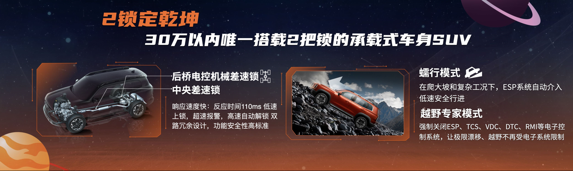 官方宣称新车为“30万内唯一搭载两把锁的承载式车身SUV”,而这两把锁其实就是中央差速锁+后桥电控式差速锁。其中一把锁来自Haldex四驱系统的中央电控差速锁,原理是带有一个电控多片离合器,在特殊情况下能让前后桥扭矩配比达到50:50。