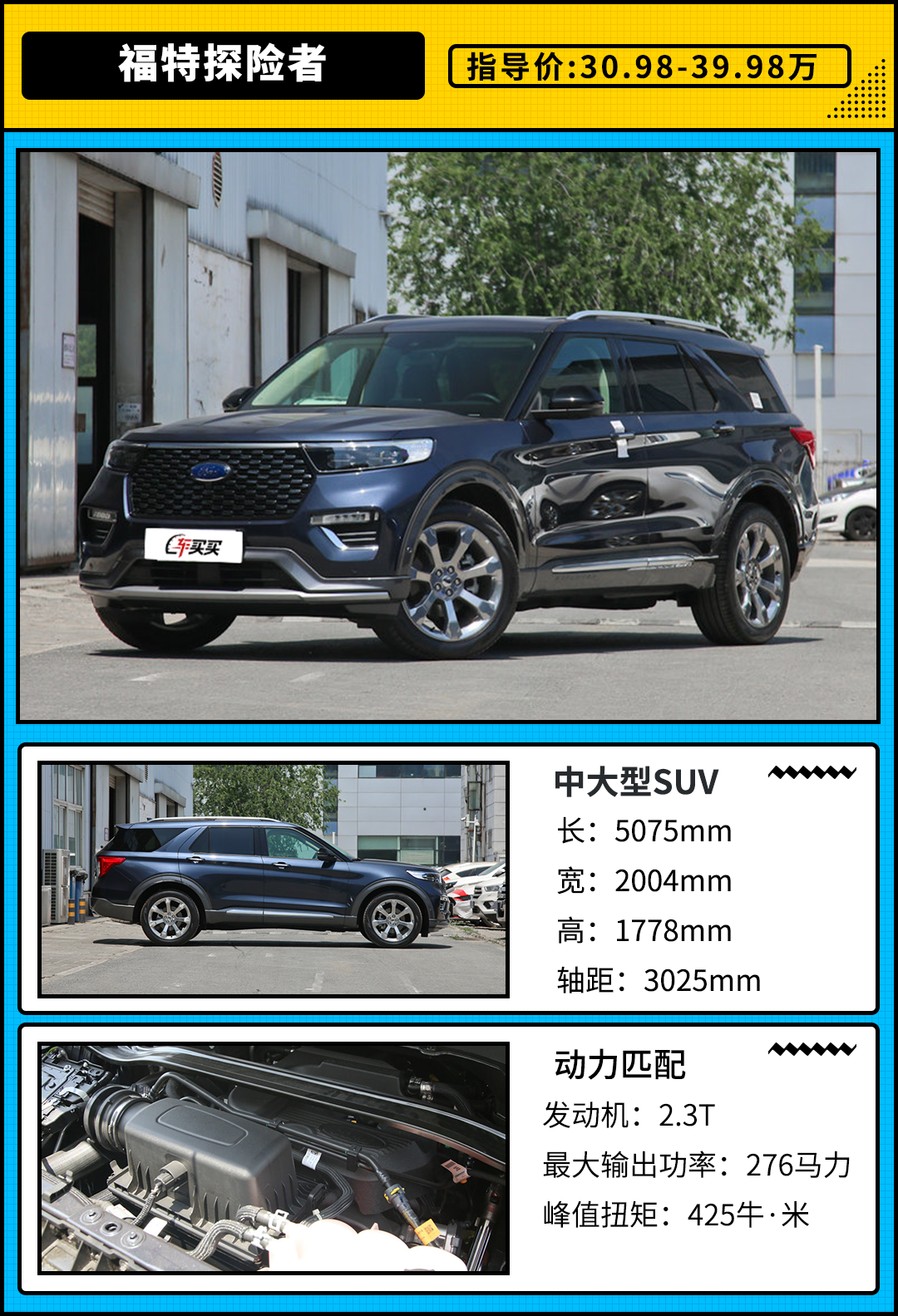 福特探险者除了在产品定位有区别与竞争车型之外,全新平台的应有提升一定的产品竞争力。2.3T+10AT的动力组合能够爆发出最大功率276马力,峰值扭矩425牛·米的数据。适时四驱和多片离合器差速锁的配备满足消费者应对户外越野的操控需求。