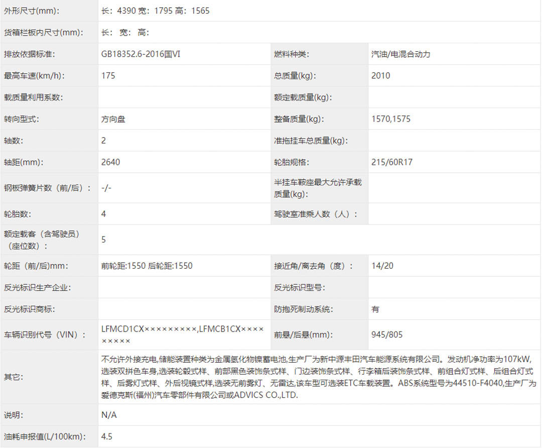 由于当时距离正式上市还有一段时间,丰田并没有公布太多的消息,于是很多媒体猜测其搭载的或许是卡罗拉同款的1.8L混合动力系统,但是在最新一期的工信部申报目录上,一汽丰田奕泽双擎的动力系统的神秘面纱终于被掀开。