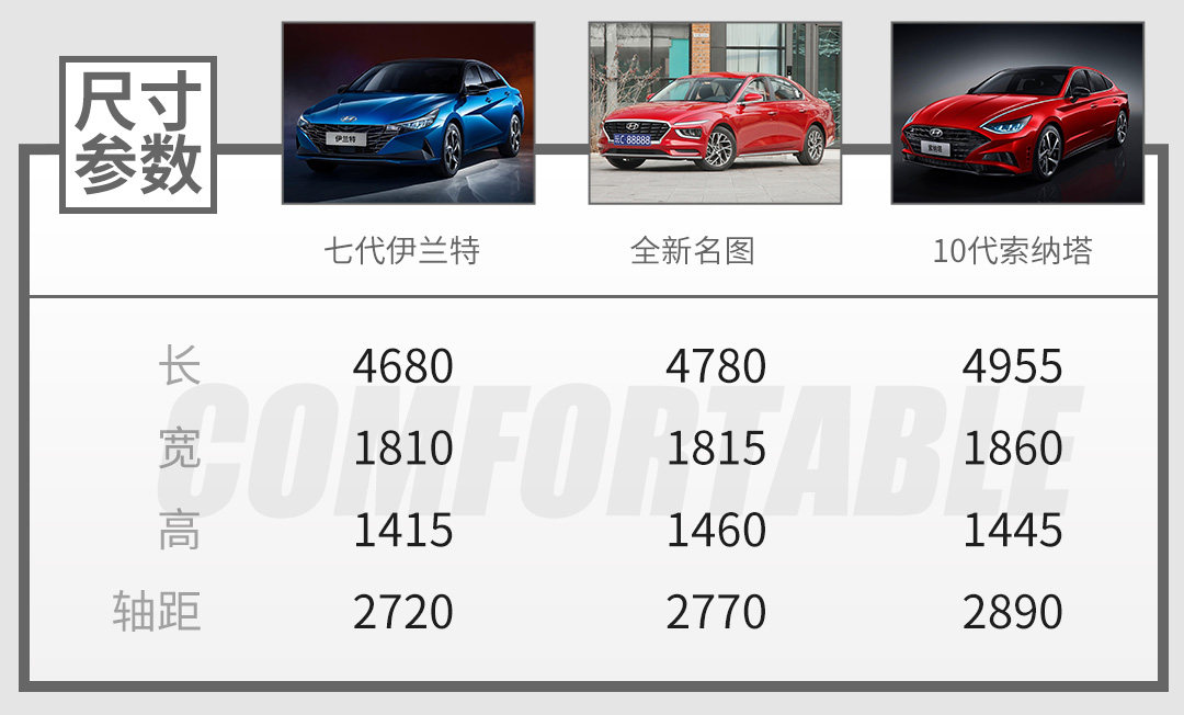 尺寸方面,全新名图的车长和轴距也夹在了两车之间,所以不难看出北京现代专为中国市场打造名图的初衷,是旨在填补伊兰特和索纳塔之间的细分市场。