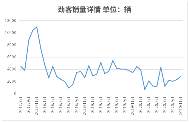 劲客诞生于国内小型SUV爆发式增长的2017年,并且在问世后销量节节攀升,到当年10月份便突破1万大关,并且在11月取得了1.1万的最好销量。不过从那之后,劲客就显得后劲不足,到了2020年,月均销量只能维持在两千台左右。