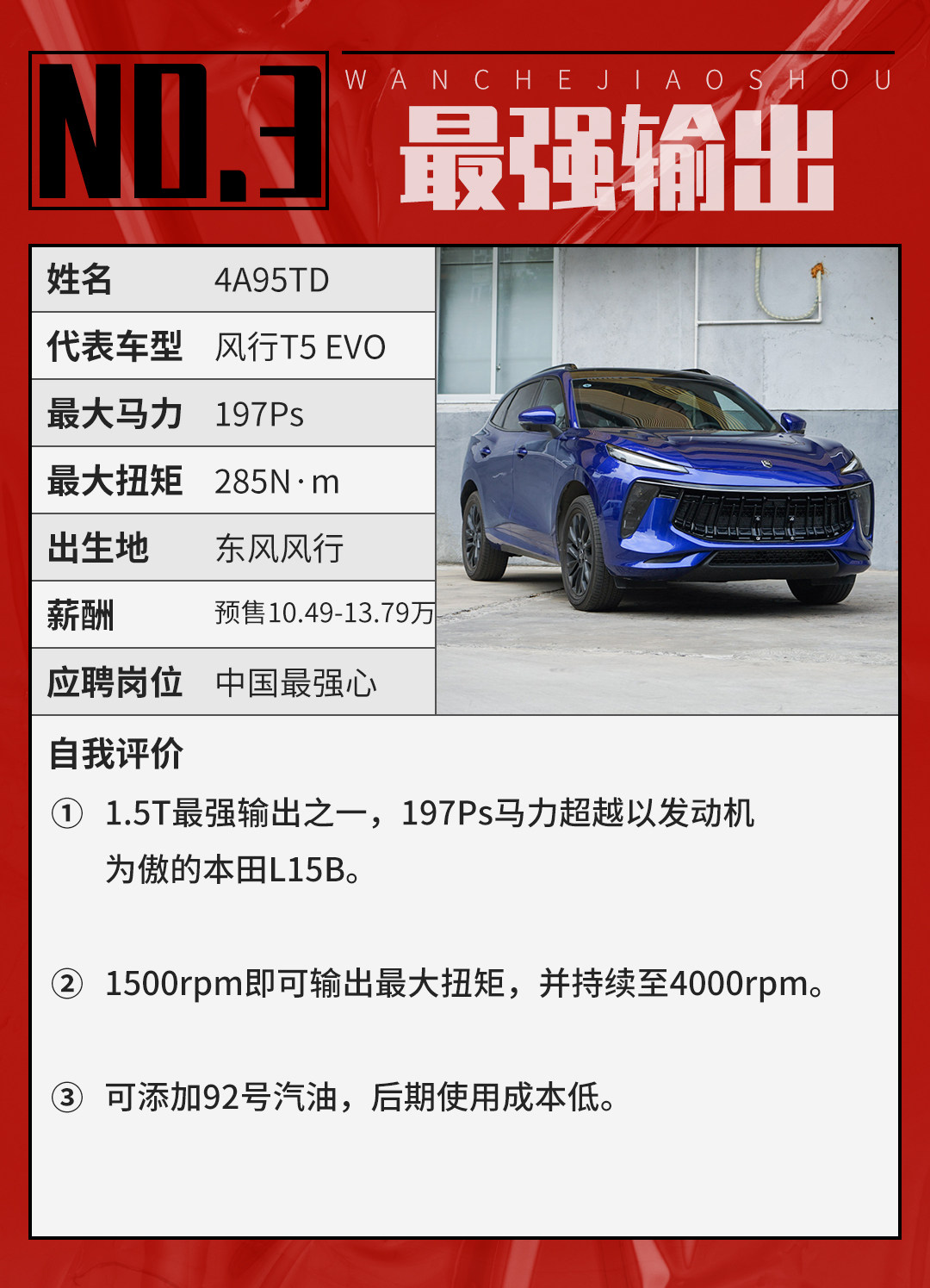 回到发动机身上,在如今国六的背景下,要压榨发动机马力并不是那么容易,很多车型为了满足国6排放标准,不得不将马力下调,就连“买发动机送车”的本田,1.5T发动机也不过区区194Ps,而T5 EVO的197Ps,将超越本田的L15发动机成为同级别的动力之最。