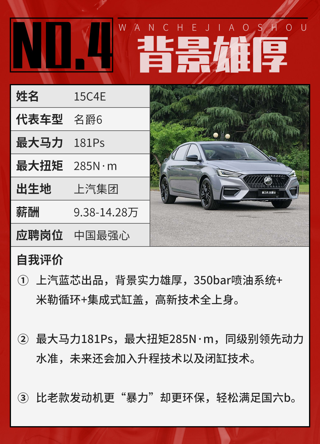 这台发动机最典型的代表就是名爵6,作为自主精品紧凑型车的代表,名爵6可以说是守护住了自主品牌的门面。而作为紧凑型车,难免会被消费者与思域对比,经过升级后的15C4E发动机,在最大动力上、峰值扭矩上都要比思域上的L15B发动机(177Ps,220N·m)更加出色,侧面表明了自主厂家在研发实力上与合资厂家不相上下。