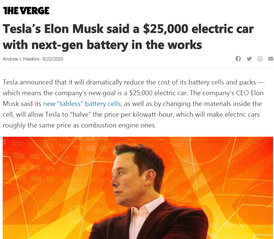 早在去年9月份特斯拉举办的股东大会和电池日活动上,马斯克表示特斯拉将会推出一款售价2.5万美元的新车,试图让每一个人都负担得起,但是有关新车的其它消息并没有透露。如今这一消息也算是对此前马斯克发言的一次认可。