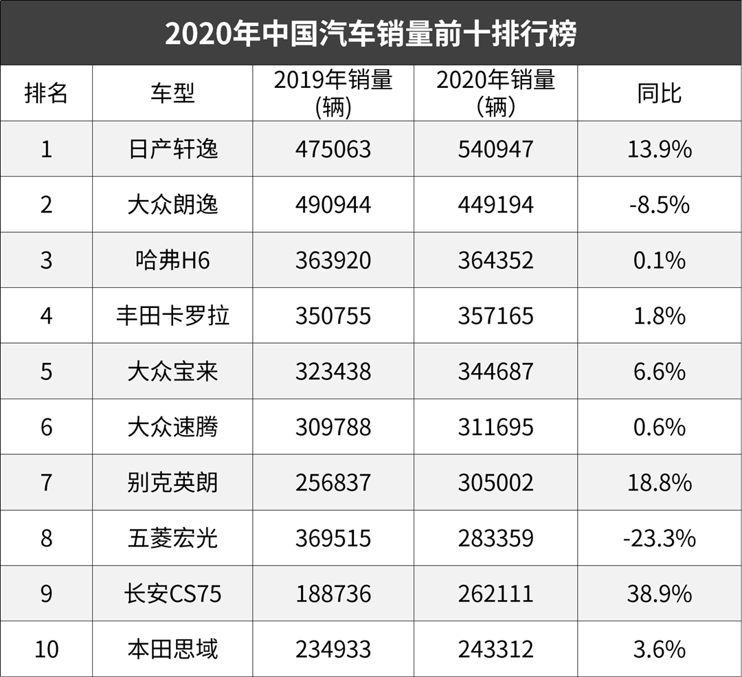 市场环境越是严峻,马太效应衍生的强者恒强、弱者恒弱现象便越发明显。就以去年最好卖的十款车为例,哪怕是在如此艰难的2020年,仍有超过8款车的年销量取得同比上涨的良好势头。